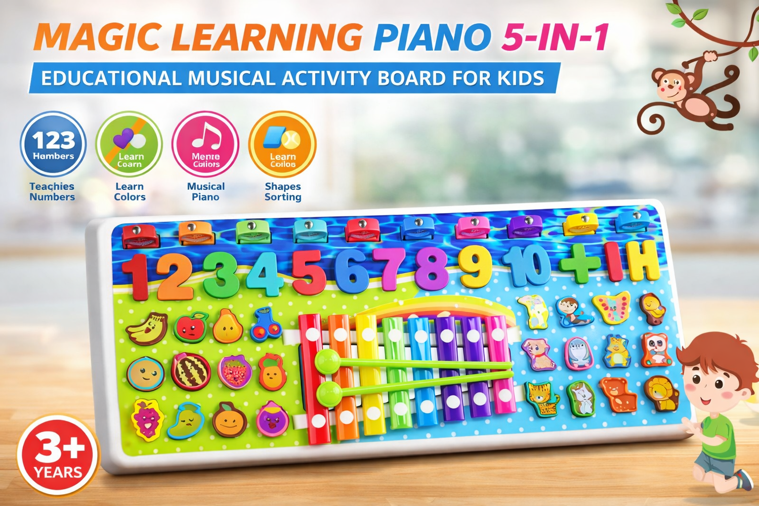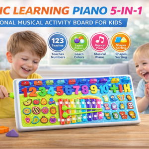 Introduce your child to fun learning and music with the 5-in-1 Educational Piano Board, a colorful activity toy designed to develop early skills through interactive play. This multi-functional board combines numbers, shapes, colors, and a musical piano to encourage cognitive development, creativity, and sensory exploration.