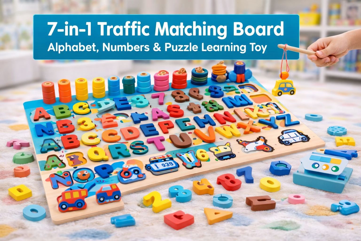 Make learning fun and interactive with the 7-in-1 Traffic Matching Board, a multi-functional educational toy designed to support early childhood development through play. This colorful learning board combines letters, numbers, shapes, vehicles, and matching activities to help children learn while having fun.