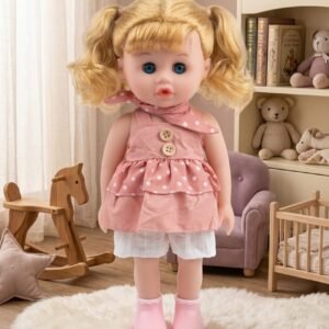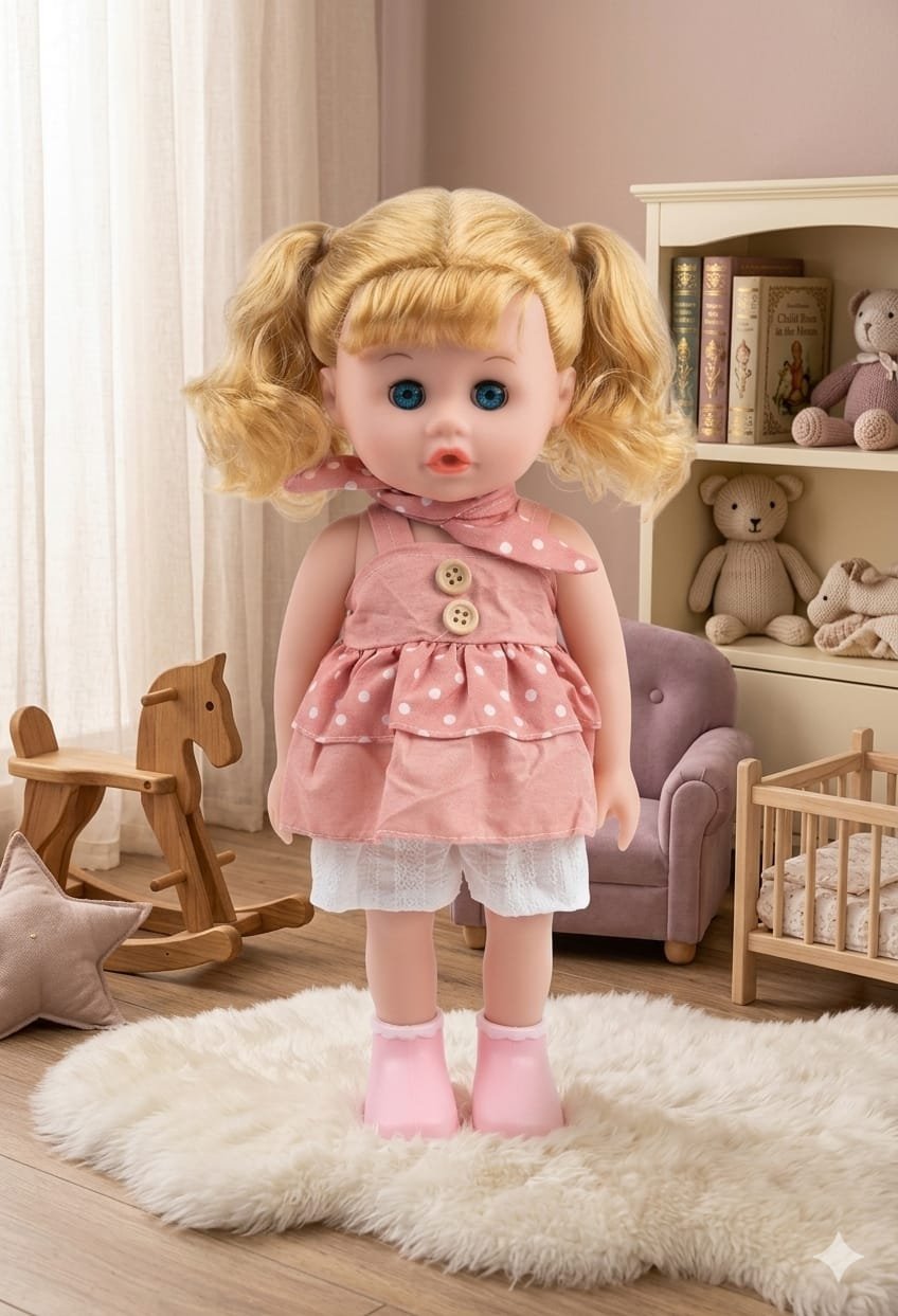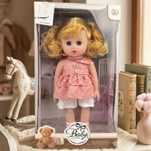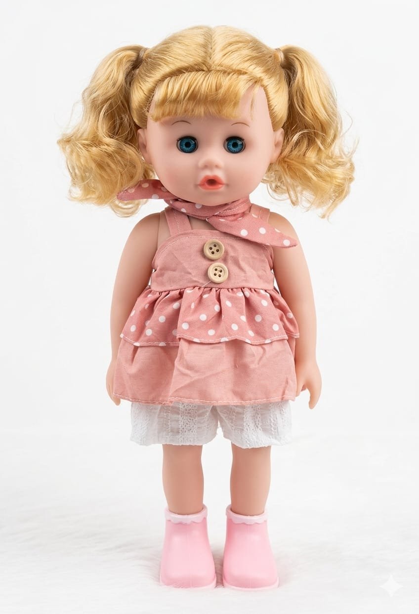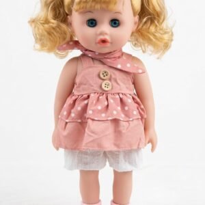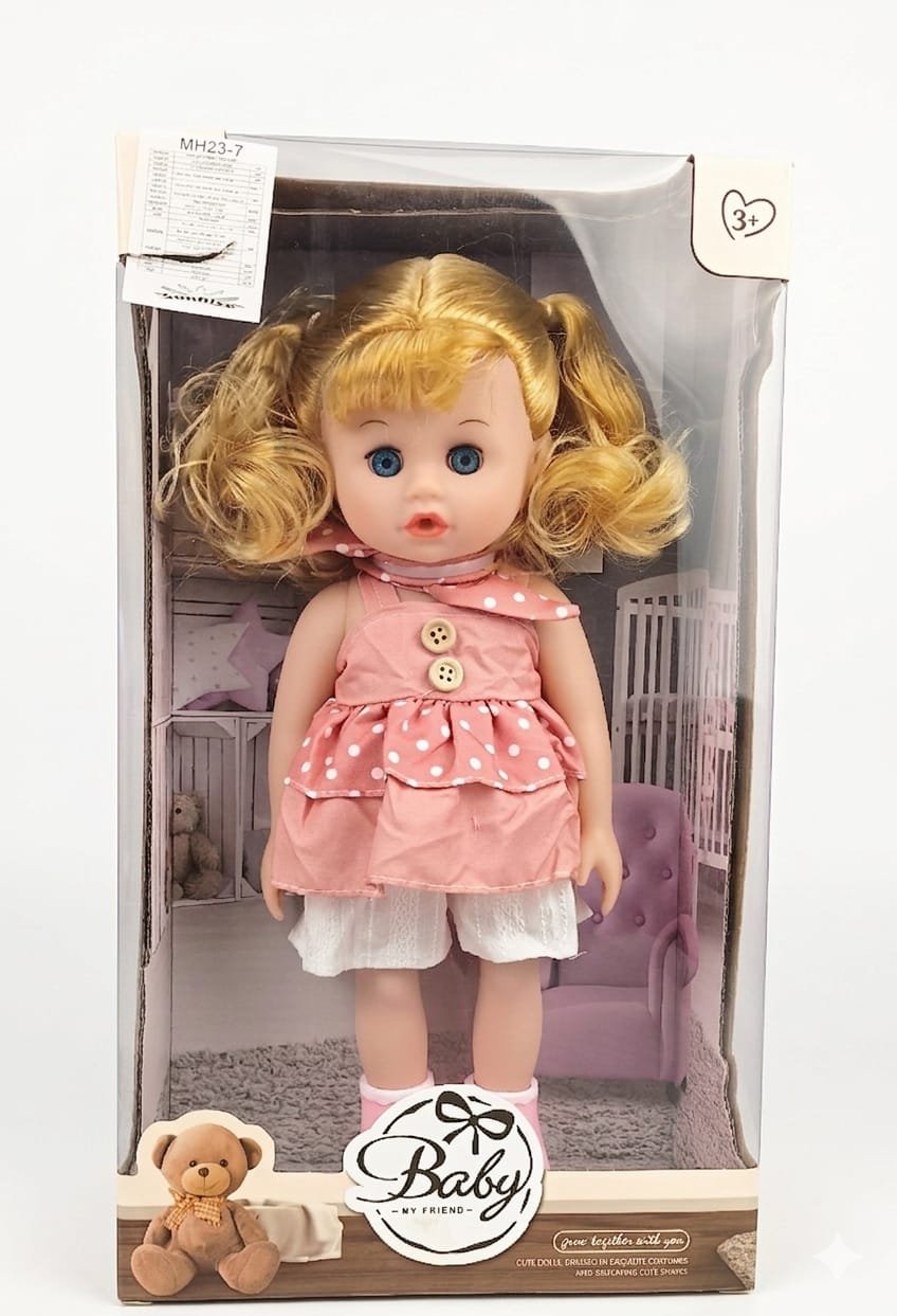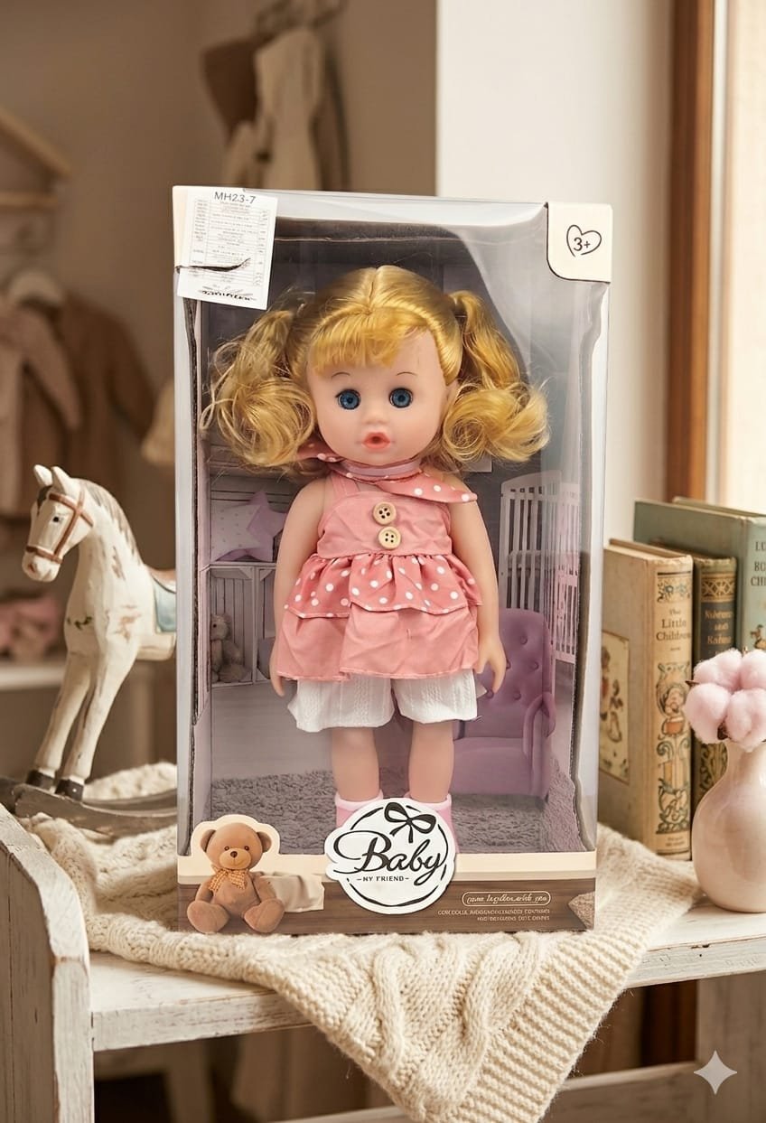 This adorable Baby My Friend doll is the perfect companion for kids aged 3 and up. Featuring bright blue eyes and soft blonde hair styled in cute pigtails, she wears a charming pink polka-dot dress with delicate details. Made from high-quality, child-safe materials, this doll is designed for imaginative play and cuddly moments.