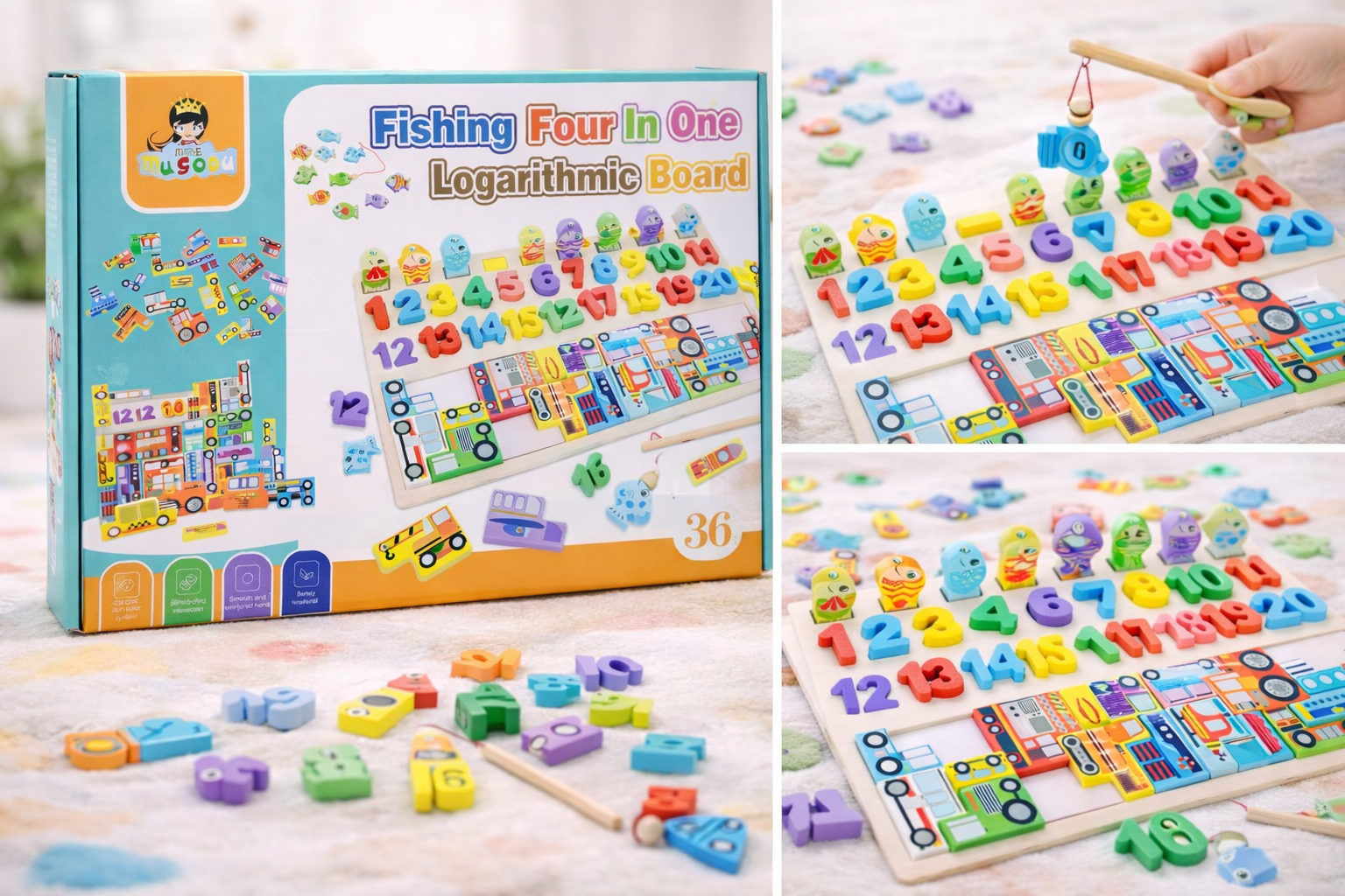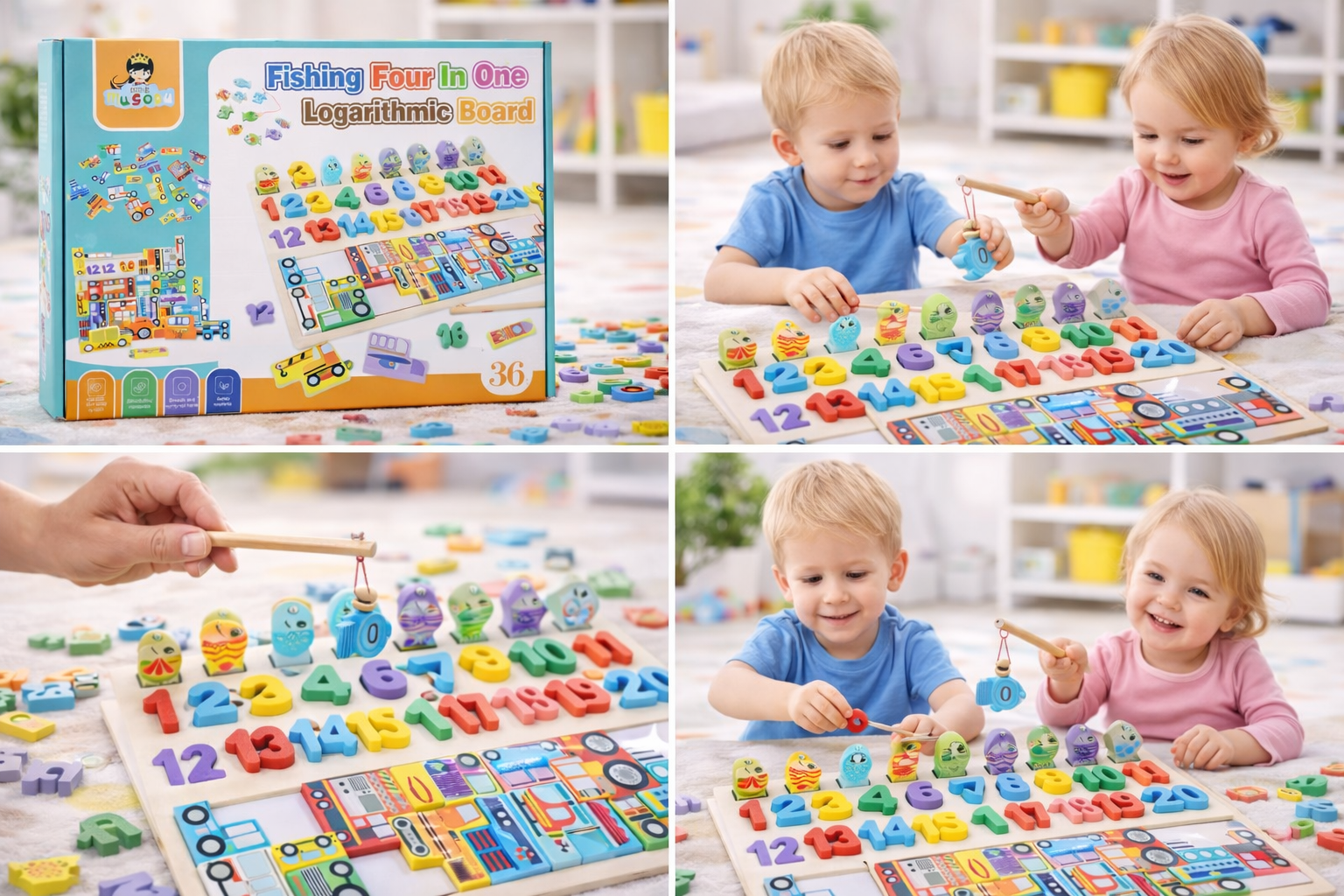 Make learning fun and interactive with the Fishing Four in One Logarithmic Board, a multi-functional educational toy designed to develop early learning skills through play. This engaging wooden activity board combines fishing game play, number recognition, shape sorting, and puzzle solving in one creative learning experience.