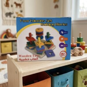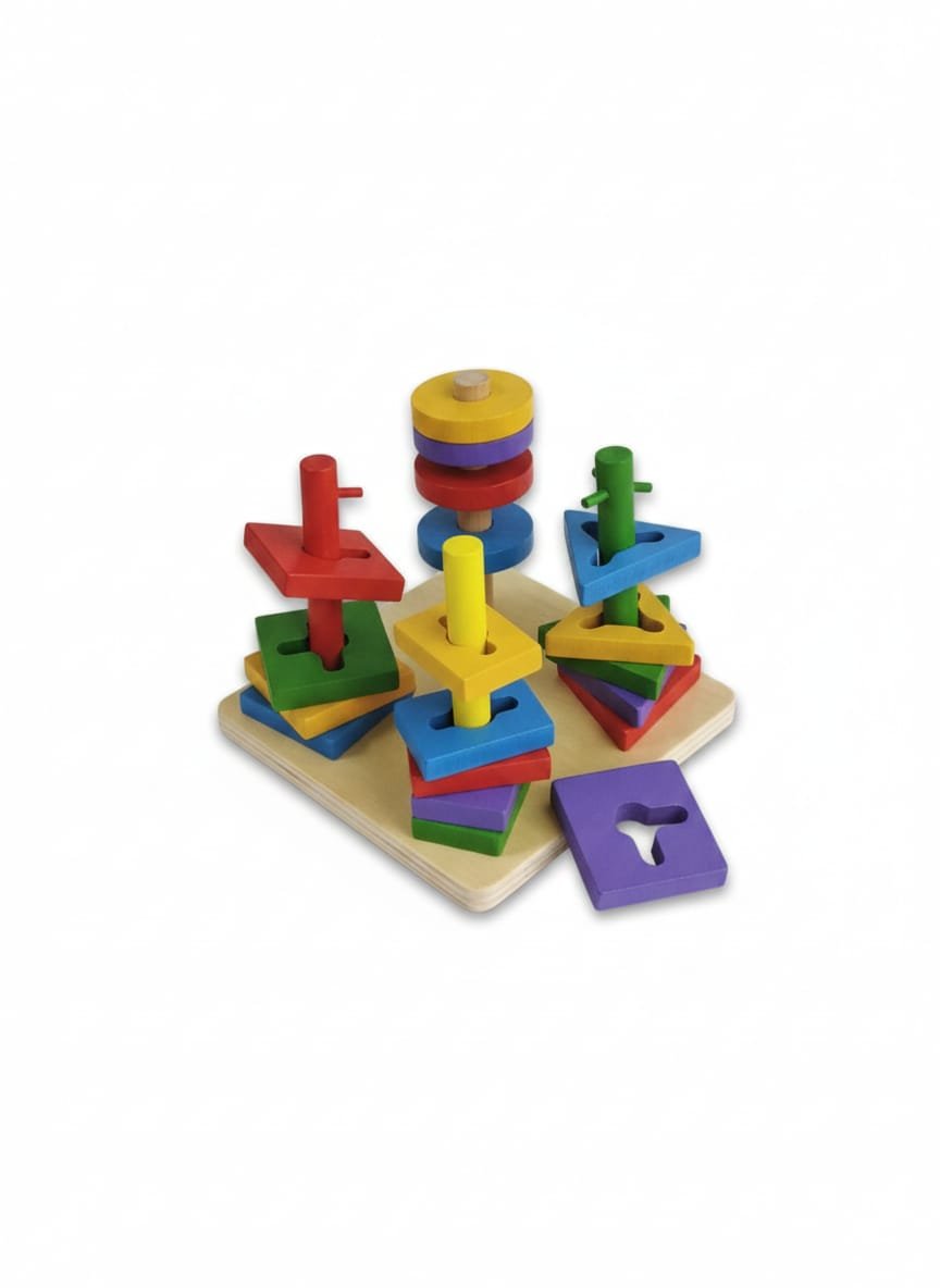 A colorful wooden educational toy designed for young children to develop early learning skills. The set features a sturdy base with four vertical columns and multiple geometric pieces in different shapes and colors. Children can stack, sort, and match the pieces onto the correct columns, helping improve hand-eye coordination, fine motor skills, color and shape recognition, and problem-solving abilities. Made from safe, durable wood with smooth edges, this toy is ideal for kids aged 3 years and above.