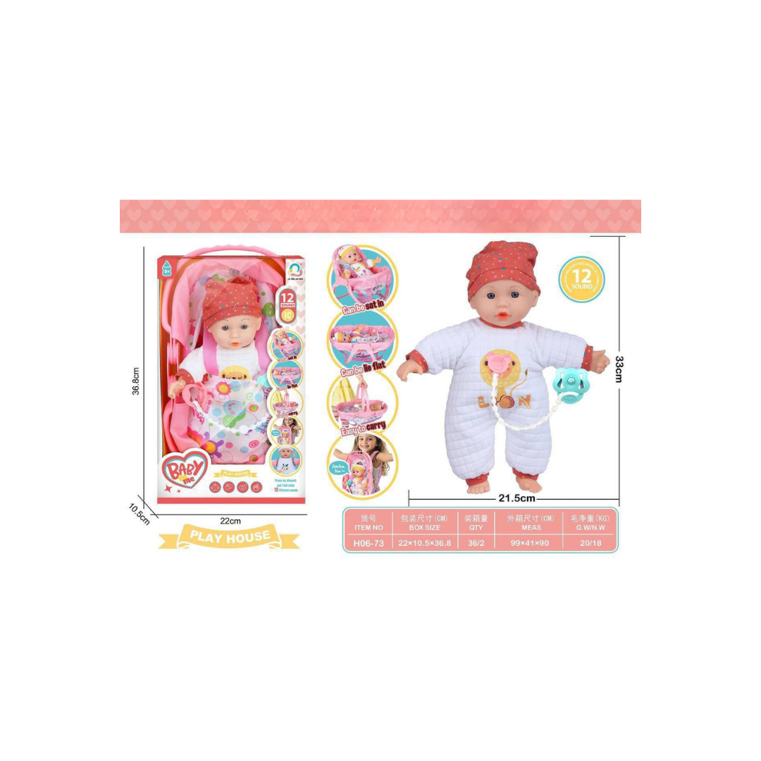 This Interactive Baby Doll is designed to give children a realistic and engaging play experience. The doll comes dressed in a cute padded outfit with a matching cap and includes a soft carry bed that can be used for sitting, lying flat, or easy carrying. With built-in sound effects (12 sounds), the doll responds to play, helping kids enjoy nurturing and role-play activities. Made from safe, durable materials, this set encourages imagination, care, and emotional development. Perfect as a gift for children aged 3 years and above.