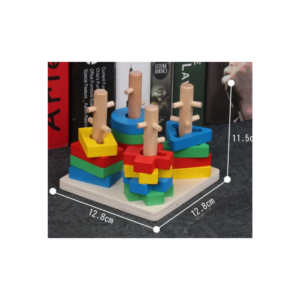 This Wooden Shape Sorting & Stacking Board is a Montessori-inspired educational toy designed to support early childhood development through hands-on play. The set includes colorful wooden shapes in different forms that children can sort and stack onto vertical wooden pegs.